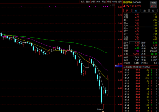 2月8日,鹏鹞环保股价大涨逾8%,收报4.65元/股,当前总市值约37亿元。