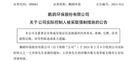 2月8日晚间,鹏鹞环保(300664)公告,公司于当日收到实际控制人之一王洪春家属的通知,王洪春因涉嫌内幕交易罪被无锡市公安局刑事拘留。