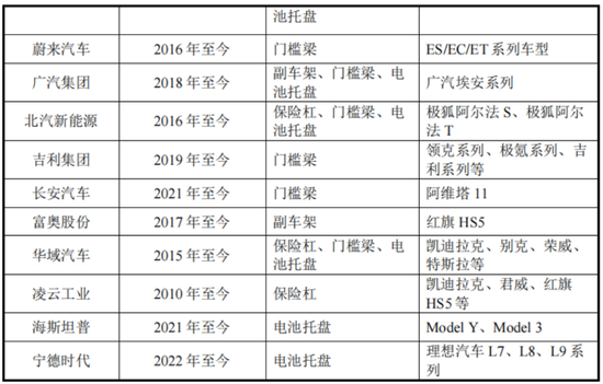 其中蔚来汽车、广汽集团、北汽新能源、特斯拉等常年为友升股份的前五大客户,友升股份的主要产品装在了许多知名车型上,如蔚来ES6、ES8,特斯拉Model Y、Model 3,理想汽车L7、L8、L9系列,红旗HS5,极狐阿尔法S、T等。