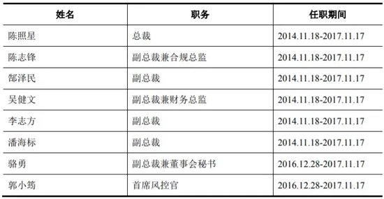 东莞证券现有的高管团队中,副总裁郜泽民生于1964年;副总裁、财务总监、董秘李志方女士生于1965年;合规总监兼首席法务官郭小筠女士生于1969年。近年来新增的高管中,投行业务总监郭天顺和经纪业务总监杜绍兴,两位高管均生于1974年;自营业务总监陈爱章女士生于1975年,与董事长同龄。首席风险官季王锋和首席信息官方浩年龄更轻,分别生于1977年和1978年。