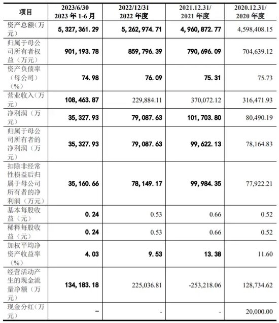 在2023年版招股书中,东莞证券披露了2020年至2023年上半年业绩数据。2023年上半年,东莞证券营业收入10.85亿元,相当于2022年全年的47.18%;归母净利润3.53亿元,相当于2022年全年的44.67%。