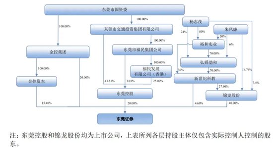 招股书显示,东莞证券无控股股东,却有实控人。持股40%的第一大股东锦龙股份,未满足控股股东条件。三家主要股东中,东莞发展控股股份有限公司(简称:东莞控股)、东莞金融控股集团有限公司(简称:东莞金控集团或金控集团)和东莞金控资本投资有限公司(简称:东莞金控资本或金控资本),实控人均为东莞市国资委,合计持股55.4%。