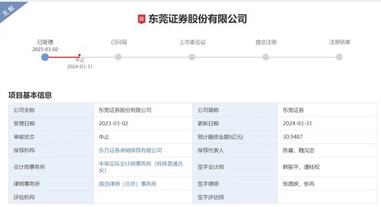 据审核项目信息,深交所于2023年3月2日受理东莞证券申请,2023年3月31日和9月27日两次更新了申报文件。时隔半年的更新,显示“中止审核”,原因是“IPO申请文件中记录的财务资料已过有效期,需要补充提交。”