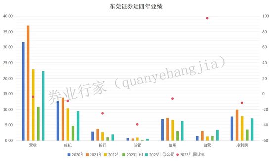 以母公司口径,东莞证券2023年营业收入为22.37亿元,同比下降3.90%;净利润为7.27亿元,同比下降11.56%。主营业务中,自营业务揽收3.42亿元,同比增长97.22%;信用业务收入6.31亿元,同比下降6.15%。经纪业务揽收9.47亿元,同比下降9.07%;投行业务和资管业务均有两位数降幅。