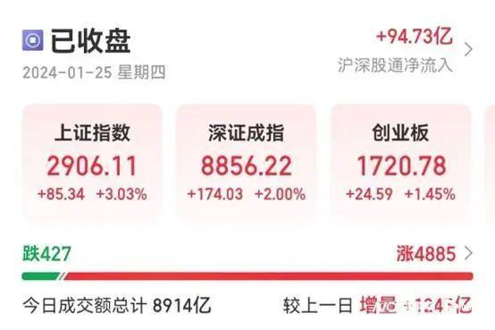 1月25日,A股三大股指开盘后开始集体上涨。截至收盘,上证综指上涨3.03%,报2906.11点;深证成指上涨2.00%,报8856.22点;创业板指上涨1.45%,报1720.78点。至此,上证综指和深圳成指均已出现“三连阳”。