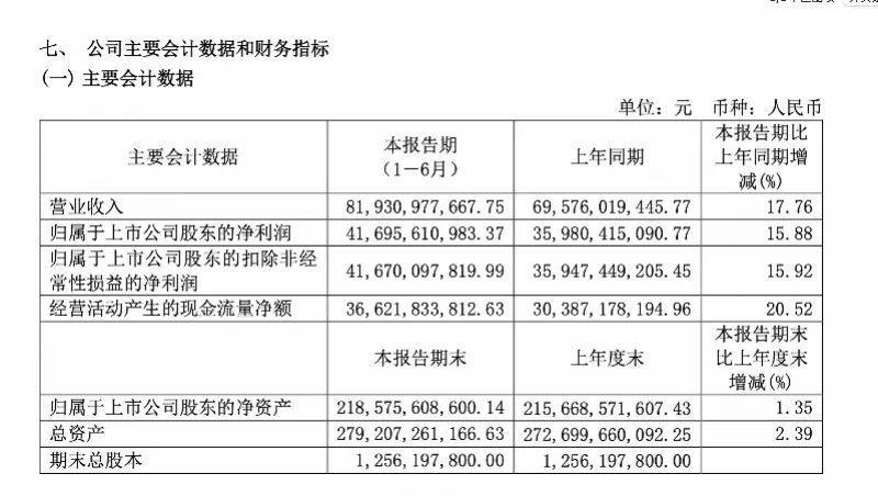 8月8日傍晚,贵州茅台发布半年报,今年上半年营收(非总营收,下同)录得819.31亿元,归母净利润为419.95亿元,同比分别增加17.76%和15.88%,半年业绩再创新高。